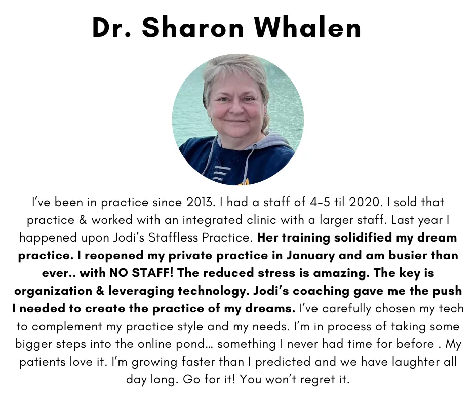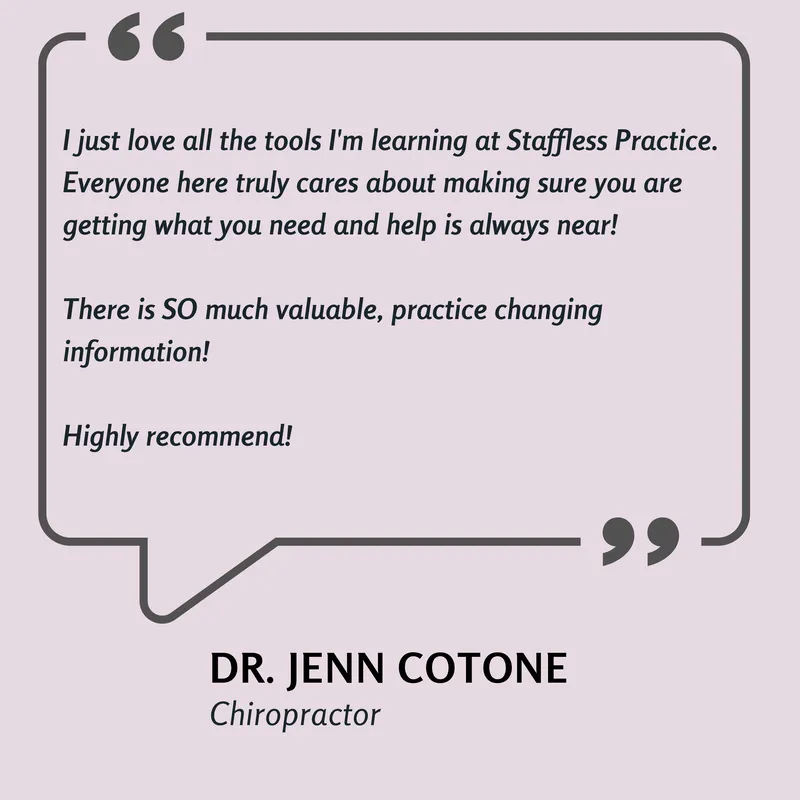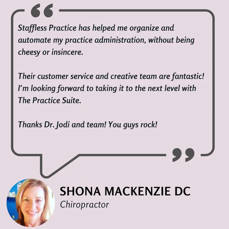 We have since refined the build of this amazing solution into The Suite Success Program—a results-driven, collaborative excellence program designed for the StaffLess Practice Journey, housed and executed within a Practice Suite Platform.